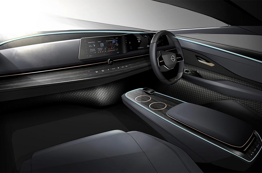 O desenho reflete a nova linguagem de design da Nissan, chamada de “Timeless Japanese Futurism” (futurismo japonês atemporal), que também é expressa no “escudo” exclusivo do Ariya Concept. Mas o design horizontal não foi escolhido apenas por sua boa aparência.