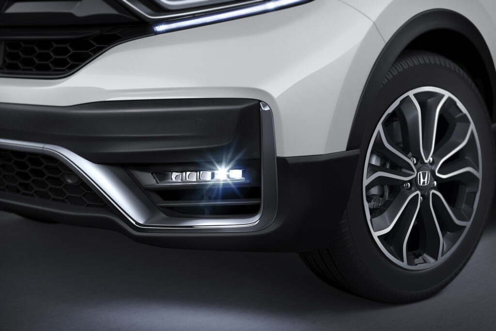 No design, as mudanças do CR-V 2021 começam na dianteira, que traz uma nova grade frontal e um novo para-choque com visual mais marcante e robusto, permitindo um posicionamento destacado dos novos faróis de neblina em LED, além de manter os faróis full LED.