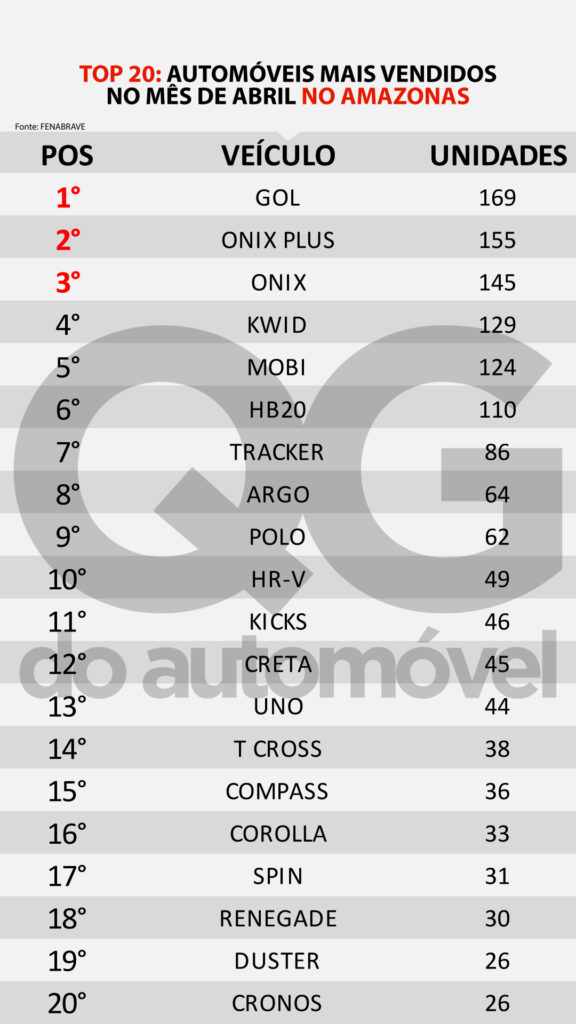 O Volkswagen Gol, tomou a liderança com 169 unidades, o chevrolet Onix Plus se manteve na segunda posição com 155 unidades emplacadas e na terceira posição vem o Onix com 145 unidades, sentindo o impacto da paralização da linha de produção.