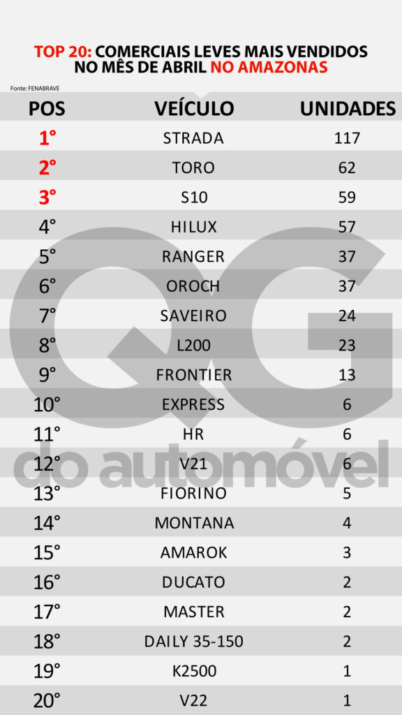 Entre os comerciais leves poucas mudanças. A Fiat Strada segue na liderança como a picape mais vendida, seguida da Toro com 62 unidades emplacadas. Fechando a terceira posição vem a Chevrolet S10, que emplacou 59 unidades.