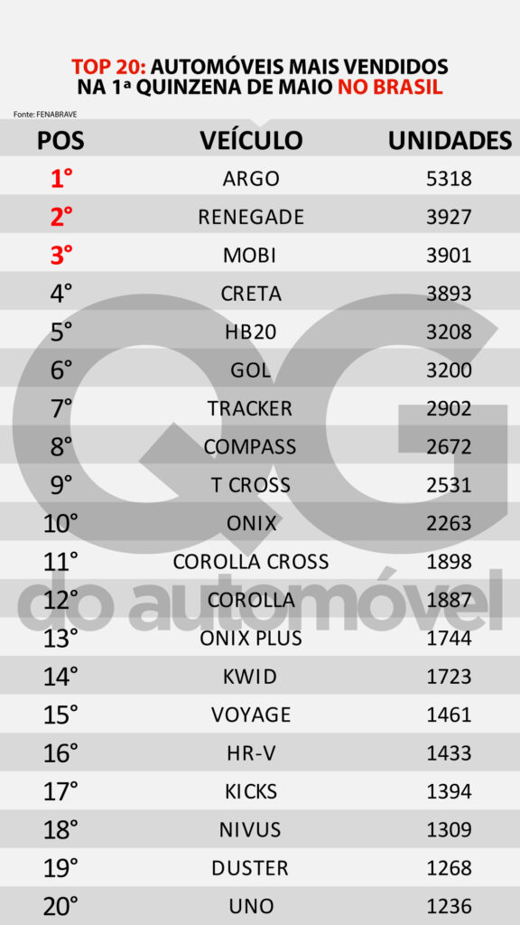 O Fiat Argo assumiu a liderança entre os carros mais vendidos, com 5.318 unidades comercializadas, seguido pelo Jeep Renegade, com 3.927 unidades emplacadas, fechando o pódio vem o Fiat Mobi com 3.901 unidades vendidas.