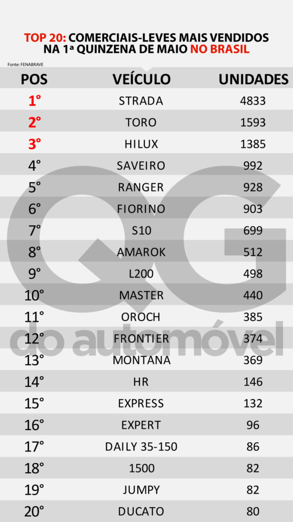 Entre os comerciais-leves a Fiat Strada segue na liderança, com 4.833 unidades emplacadas, na segunda posição vem a Fiat Toro, com 1.593 unidades. Já na terceira posição a Toyota Hilux com 1.385 vendidas. Destaque é a RAM 1500 entre os vinte mais vendidos na quinzena.