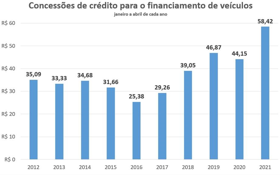 Neste ano, foram liberados mais de R$ 58,4 bilhões em concessões para aquisição do veículo. Isso gerou um crescimento de 32,4% sobre o mesmo período do ano passado, quando houve R$ 44,1 bilhões em concessões.