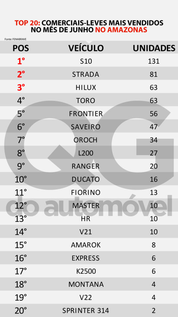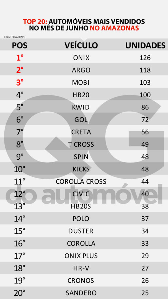 Diferente do que ocorreu em outras regiões do país, onde o grupo Stellantis (fabricante da Fiat, Jeep, Citroen, Peugeot, entre outros) dominou com sete dos seus carros entre os dez mais vendidos, no Amazonas o ranking foi bem mais variado. No pódio a Chevrolet teve pátio suficiente para ocupar a primeira e a segunda posição, com a picape S10 emplacando 131 unidades e com Onix vindo logo em seguida, com 126 unidades comercializadas. O Fiat Argo ficou na terceira posição com 118 veículos vendidos.
