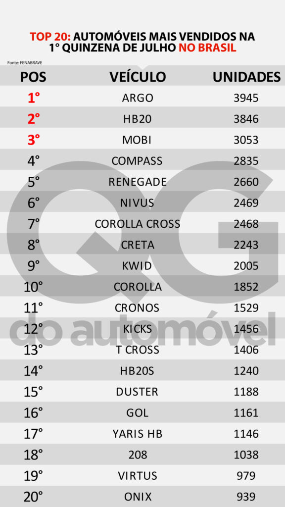 TOP 20 AUTOMÓVEIS MAIS VENDIDOS NA QUINZENA DE JULHO