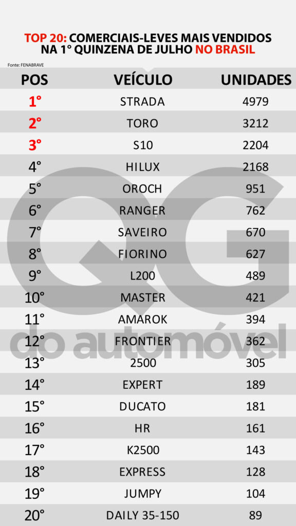 A liderança continua com a Fiat Strada, com 4.979 unidades emplacadas, na segunda posição vem irmã Fiat Toro, com 3.212 unidades. Já na terceira posição a Chevrolet S10 com 2.204 vendidas.