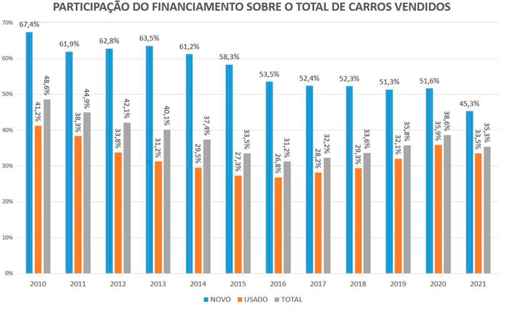 Mas, apesar desse “boom” em financiamentos, isso não reflete efetivamente em aumento de “share”. A penetração dos financiamentos nas vendas de carros (novos e usados) é de apenas 35%. Sendo que a penetração em veículos novos é de 45% (pior resultado dos últimos 12 anos) e em veículos usados é de 33%. Ou seja, existe ainda um oceano para o pessoal dos bancos explorarem!