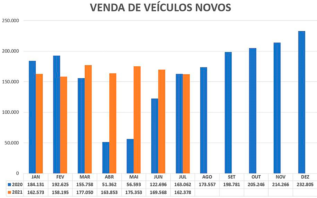 Caros leitores, digníssimas leitoras: encerrado o mês de julho, as vendas de carros totalizaram 162,4 mil unidades vendidas, o que representou uma ligeira queda de 4,3% sobre o mês passado, quando tivemos 169,6 mil carros vendidos. Se compararmos com o mesmo período do ano passado (julho/2020), rolou aqui um “empate técnico”! Em julho do ano passado tivemos 163,1 mil carros vendidos – o que nos dá uma retração de 0,4%.
