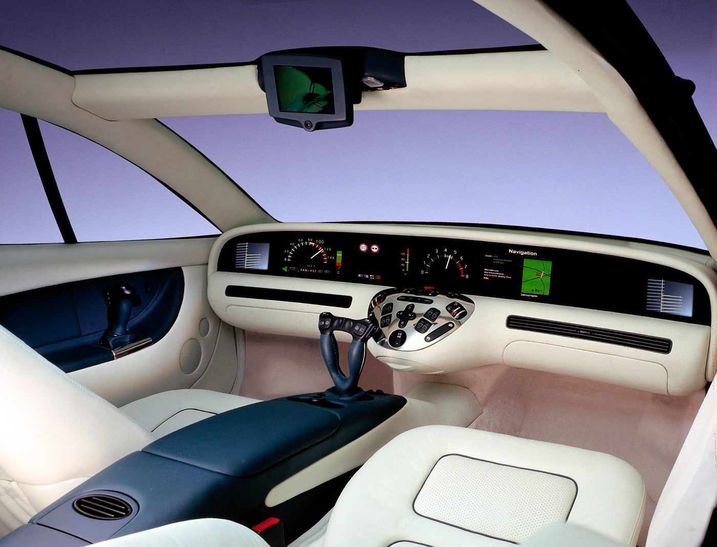 Mercedes-Benz F 200 Imagination concept car. It was unveiled at the Paris Motor Show in October 1996 and featured numerous innovations, including sidestick steering, “drive by wire” and an early implementation of today’s Mercedes-Benz widescreen cockpit. Interior shot with cockpit. (Photo signature in the Mercedes-Benz Classic archive: A96F4937)