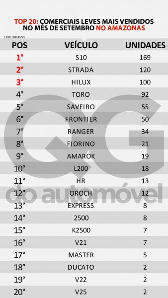 Entre os comerciais leves a Chevrolet S10 ficou no topo das vendas, com o número de 169 unidades. A picape Fiat Strada ficou em segundo lugar, com 120 comercializadas em todo o território amazonense. A Hilux, emplacou 100 unidades, obtendo a terceira colocação.