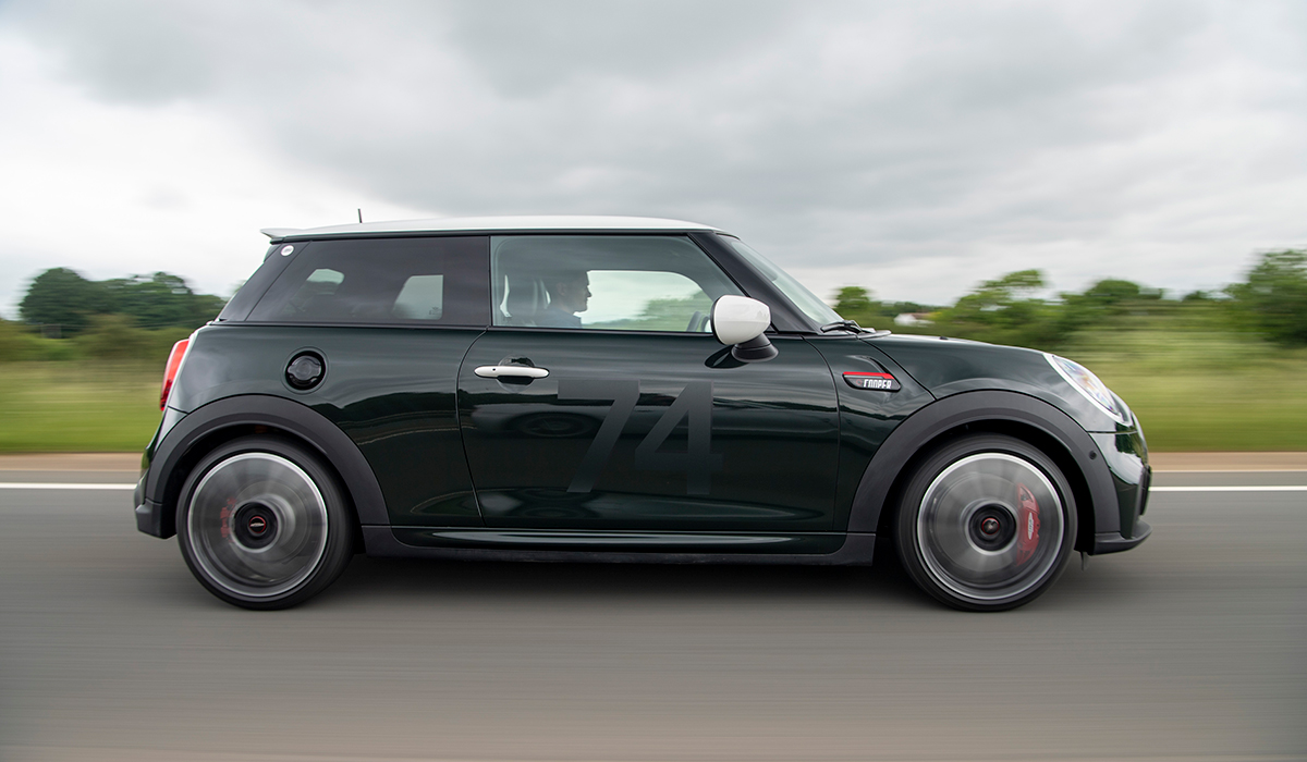 Essas características externas são complementadas por listras brancas no capô e uma linha vermelha, um número 74 no capô e nas portas dos veículos da edição, é uma alusão ao início de uma carreira esportiva, já que o clássico Mini Cooper já usava o número inicial 74 quando ganhou sua primeira classe na pista.