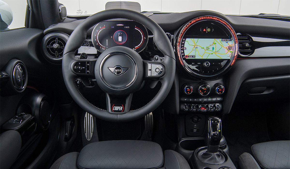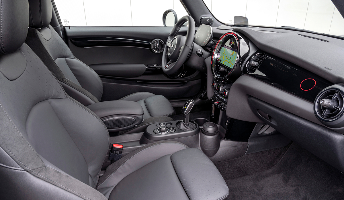 O interior inclui bancos esportivos John Cooper Works com acabamento em couro / Alcântara Preto Carbono, pedaleiras em aço inoxidável e acabamentos interiores em Piano Black de alto brilho. O anel vermelho do logotipo original de John Cooper adorna a tampa do porta-malas e a superfície interna do lado do passageiro. Do lado do motorista, a superfície interna apresenta as assinaturas de John, seu filho Mike e seu neto, Charlie Cooper.