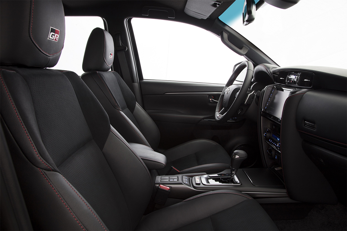 No interior, o novo SW4 GR-S tem bancos em couro Ultrasuede® e detalhes de costuras em vermelho, tendo o emblema TOYOTA GAZOO Racing bordado no apoio de cabeça. Por se tratar de versão especial, há uma placa de identificação GR-S, alocada próximo ao painel, com número da unidade. Os medidores analógicos tem tela TFT de 4.2”, com uma animação exclusiva da marca GR-S. Entre os equipamentos de conveniência, destaque ao carregador sem fio para smartphones. Nas pedaleiras, o material é todo produzido em alumínio e, no volante, o revestimento vem com detalhes microperfurados, aliados à costura vermelha.