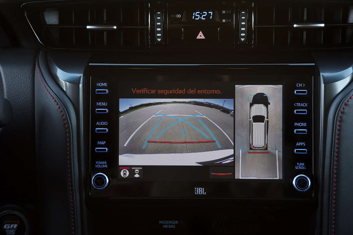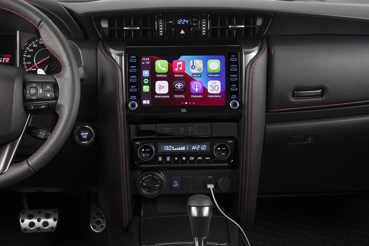 O novo SW4 GR-S mantém o sistema de conectividade com tela sensível ao toque de 8”, com sistema Android Auto® e Apple CarPlay®, conexão USB, navegador por satélite (GPS), TV Digital e função Bluetooth®. O sistema de áudio é o JBL® com 10 alto-falantes e subwoofer [tweeters (x2), squawkers (x2), alto-falantes (x6) e subwoofer (x1)].