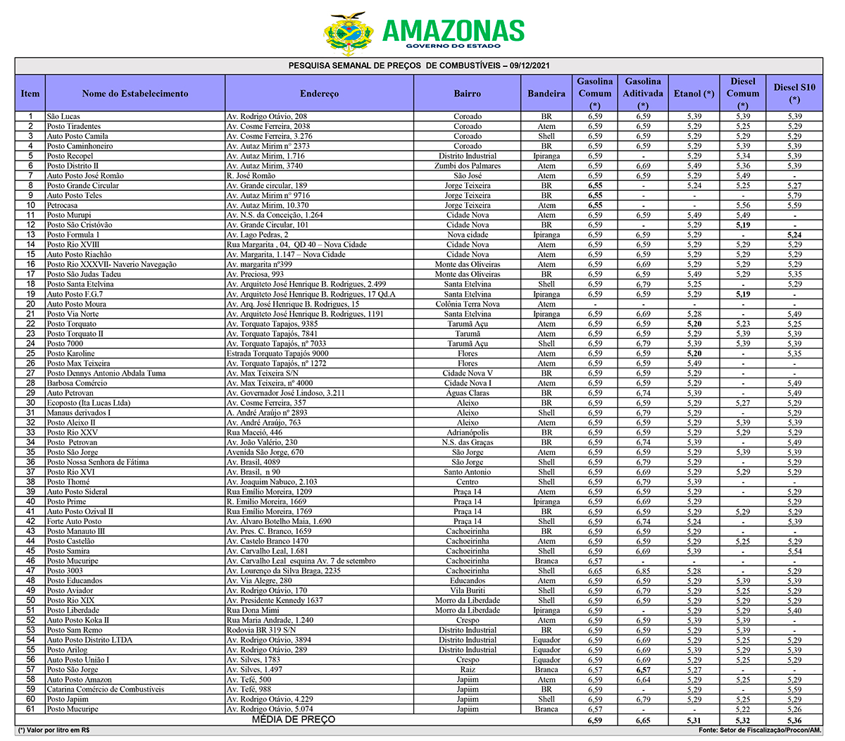 A pesquisa de preços de combustíveis, abrangendo a Gasolina Comum, Gasolina Aditivada, Etanol, Óleo Diesel Comum (não aditivado) e Óleo Diesel S10 (aditivado), desta semana, realizada pelo Procon-AM, por meio do Setor de Fiscalização, traz o levantamento de preços dos produtos praticados em 61 postos espalhados por Manaus.
