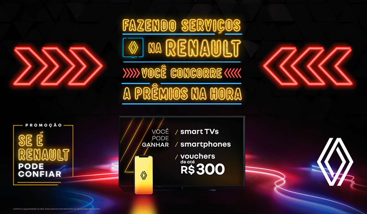 A Renault do Brasil lança a nova edição da campanha “Se é Renault, pode confiar”. Os clientes que realizarem serviços em uma concessionária da marca poderão participar da promoção para concorrer a prêmios instantâneos de vouchers de até R$ 300 para uso nas concessionárias, além dos sorteios de smartphones e smart TVs.