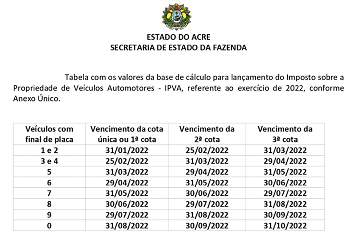 O pagamento do IPVA está disponível desde o dia 1º de janeiro. O valor pode ser pago à vista – com 10% de desconto – ou parcelado em até três vezes. O prazo para o pagamento da cota única tem início no dia 29 de janeiro, com final de placas 1 e 2. O Departamento Estadual de Trânsito (Detran) do Acre informou que, para o pagamento do imposto, o proprietário deverá emitir o Documento de Arrecadação Estadual (DAE) por meio do site, ou retirá-lo no Posto Fiscal do IPVA, localizado nas dependências do Departamento Estadual de Trânsito (Detran), ou ainda nas agências da Secretaria de Fazenda (Sefaz) de cada município.