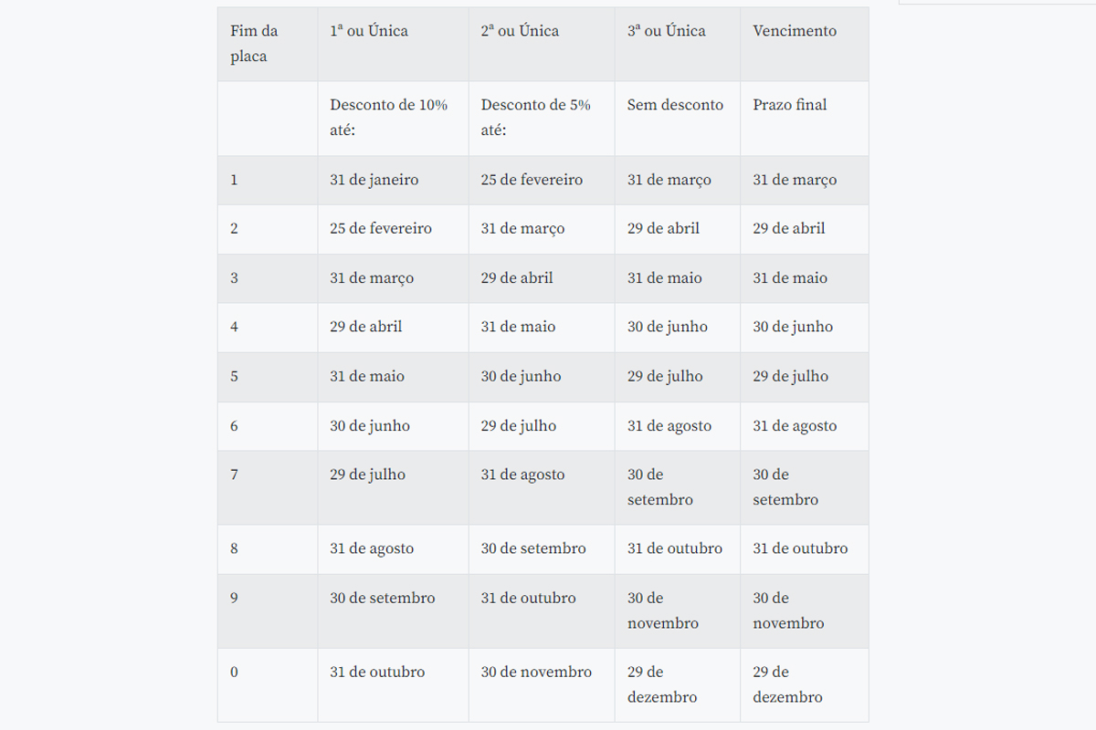 Da mesma maneira, as placas com final 2 tem até prazo final de pagamento do imposto até abril, as de final de 3 até maio, as de final 4 até junho, e assim sucessivamente, sempre se somando dois ao número de final da placa para se saber o último mês possível para o pagamento do imposto (no caso das placas de final 0, considerar o número 10).
