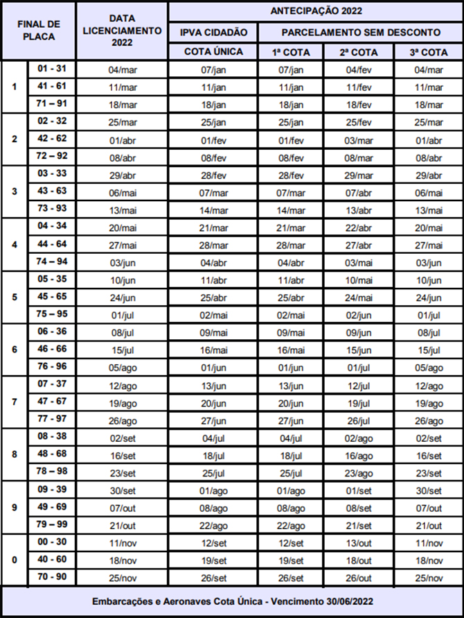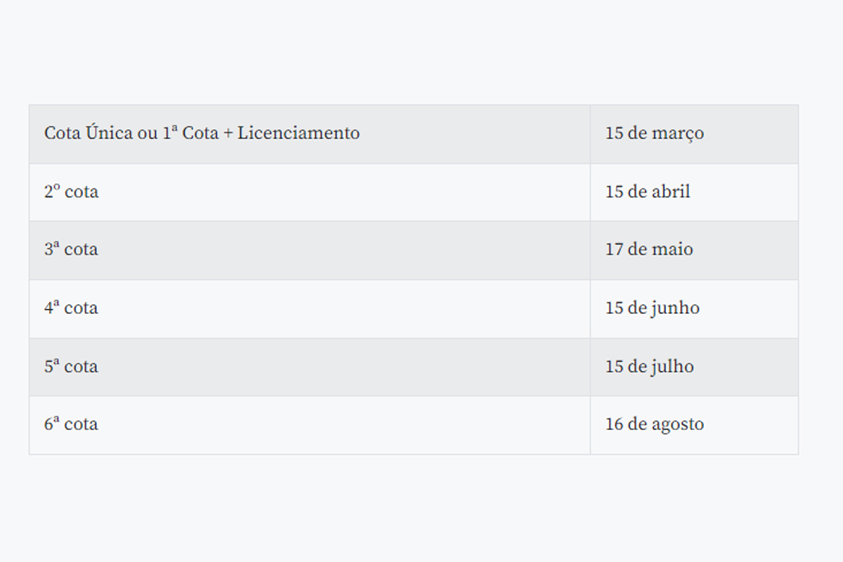 Além da cota única, o contribuinte poderá optar por parcelar o imposto em três vezes, antes do vencimento, sem desconto, ou pelo pagamento integral junto com o licenciamento, sem desconto.