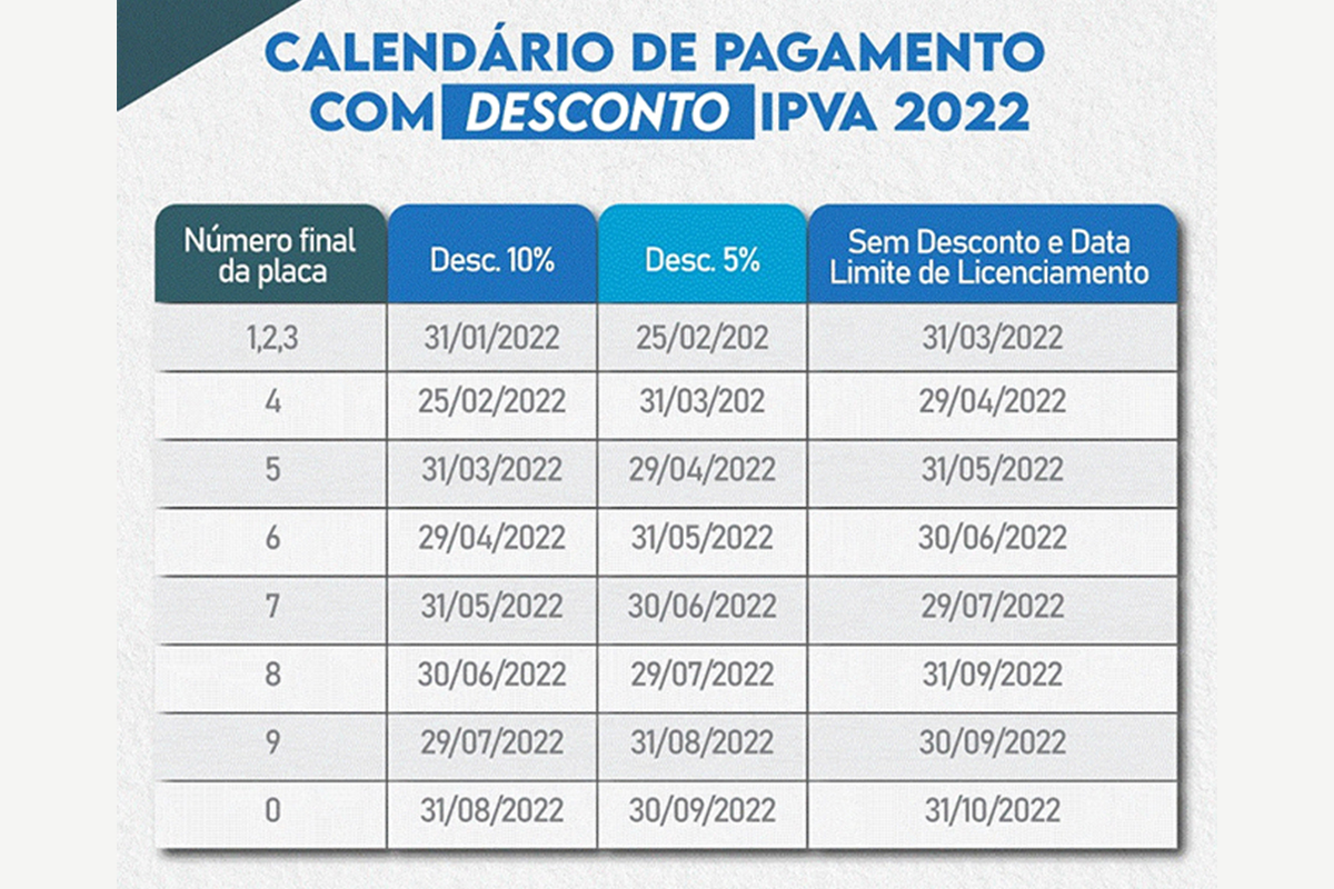 Há também a aplicação de um percentual de desconto para os proprietários de veículo que não cometeram infrações de trânsito. Quem não cometeu infração no ano passado, tem direito a 10% de desconto. Quem não teve multa em 2020 e 2021, 15%; e quem foi regular nos últimos três anos, 20%. Mais informações sobre a base de cálculo do imposto podem ser encontradas na página da Sefaz.
