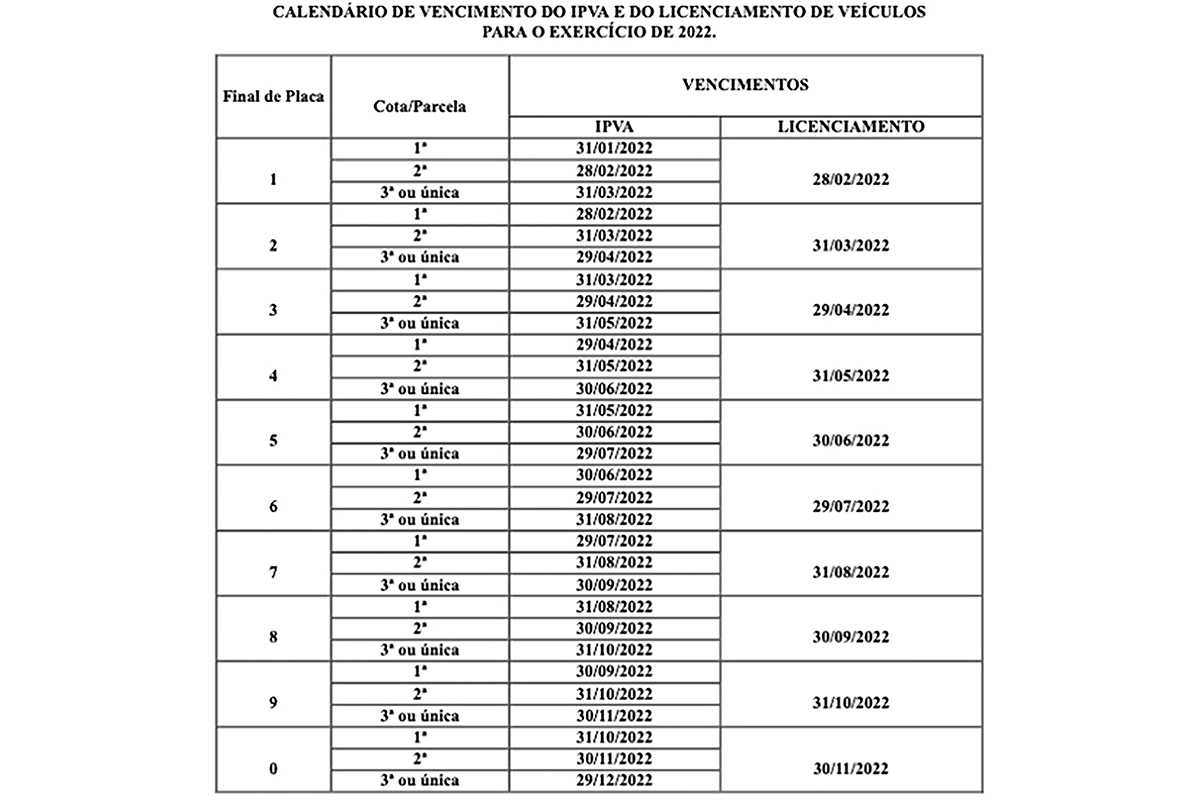 Por ser de arrecadação estadual, cada unidade federativa (UF) define o próprio calendário de vecimento. O pagamento do IPVA é obrigatório e a alíquota apresenta variação conforme o modelo e a o ano de fabricação do veículo, e também o estado onde o veículo está registrado.