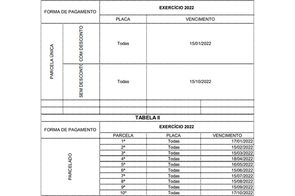 Em Tocantins, o contribuinte poderá pagar o IPVA 2021 em parcela única ou em até dez parcelas. Se a opção for por parcela única, quem efetuar o pagamento até o dia 17 de janeiro de 2022 terá desconto de 10%. Após esse prazo, o contribuinte terá até o dia 17 de outubro para pagar o IPVA 2022, mas sem o desconto.