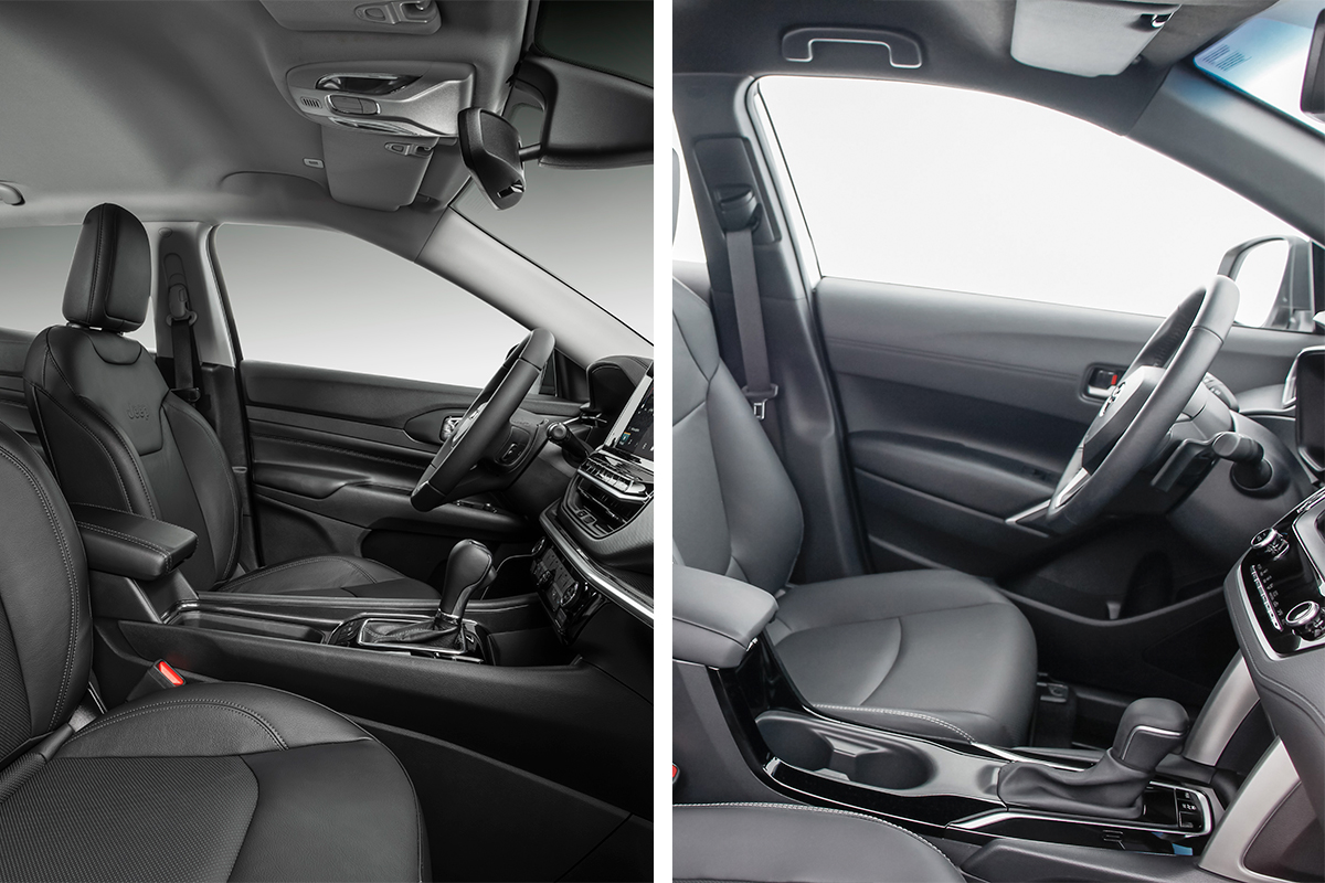 Atualmente, o mercado de SUVs é tão competitivo que as marcas não podem deixar passar nenhum detalhe, muito menos em itens que o consumidor se acostumou a ter dentro de carros nessa faixa de preços. Nesse quesito, Compass e Corolla Cross não decepcionam. De fábrica o Jeep tem volante com ajuste de altura e profundidade, alarme, banco do motorista com regulagem de altura, chave de presença com telecomando, central multimídia, seis airbags, controle de tração e estabilidade, direção elétrica, ar-condicionado dual-zone, volante com acabamento em couro, três entradas USB e muito mais. O Toyota tem sete airbags, ar-condicionado dual-zone, banco do motorista com regulagens, central multimídia, controle eletrônico de tração e estabilidade, faróis com acendimento automático e regulagem de altura, alarme volumétrico entre outros itens.