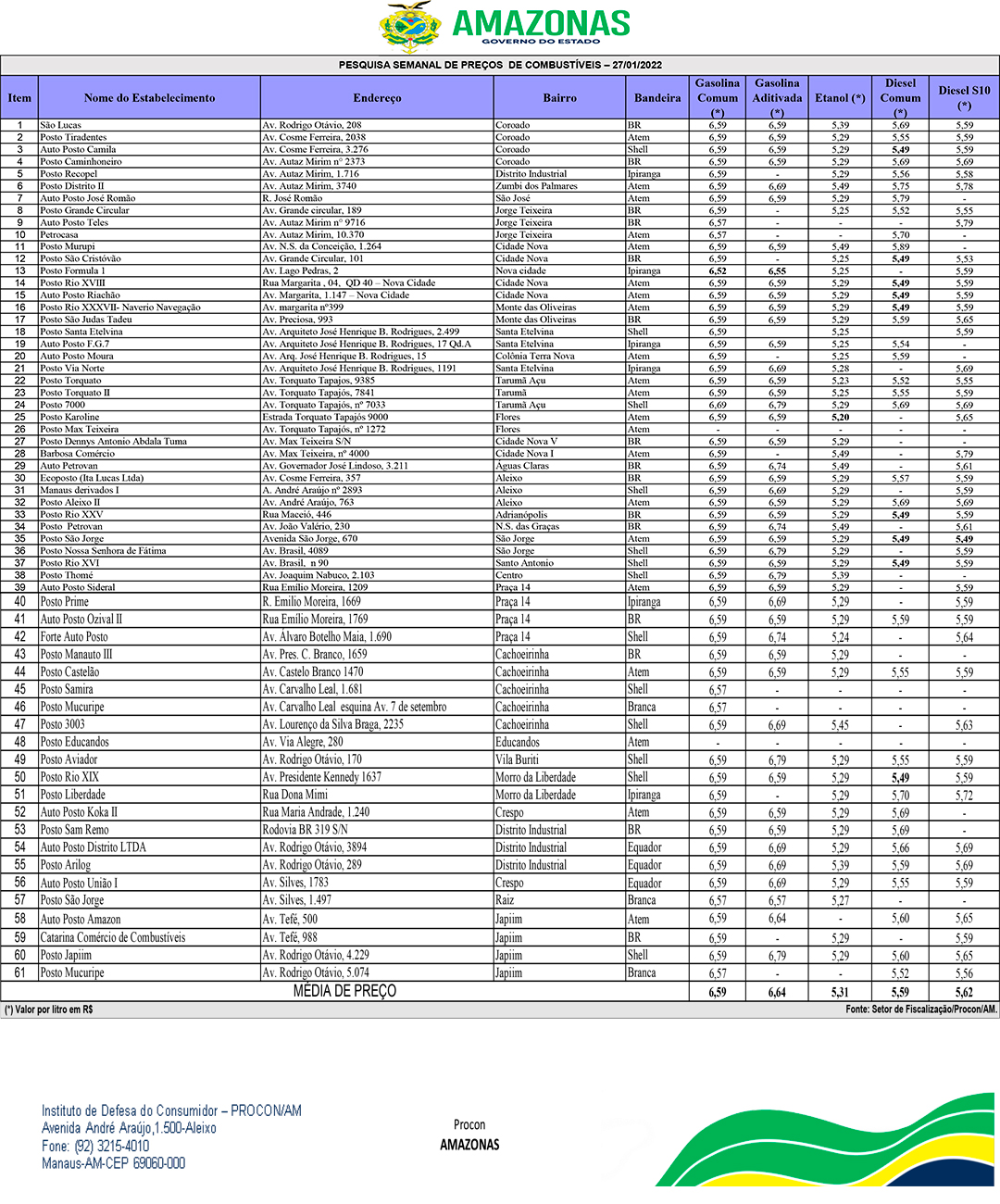 O Procon-AM divulgou nova pesquisa que aponta os preços dos combustíveis na última semana de janeiro. O levantamento abrange Gasolina Comum, Gasolina Aditivada, Etanol, Óleo Diesel Comum (não aditivado) e Óleo Diesel S10 (aditivado), realizada por meio do Setor de Fiscalização, em 61 postos espalhados por Manaus.