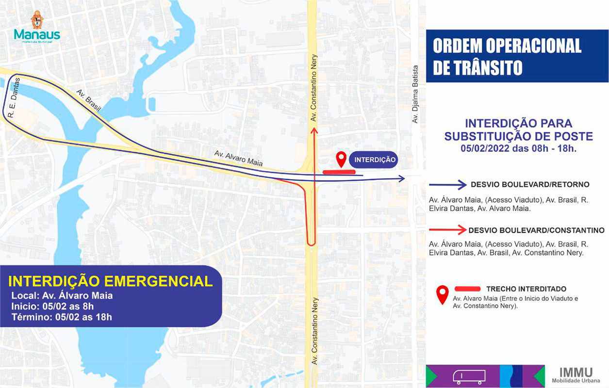 O IMMU vai interditar a alça de retorno que dá acesso à avenida Constantino Nery e ao retorno por baixo do complexo viário Dom Jackson Damasceno Rodrigues, conhecido como “viaduto da avenida Senador Álvaro Maia”, no sentido bairro. O bloqueio tem o objetivo de substituir os postes da rede elétrica que estão danificados e acontecerá neste sábado, 5/2.
