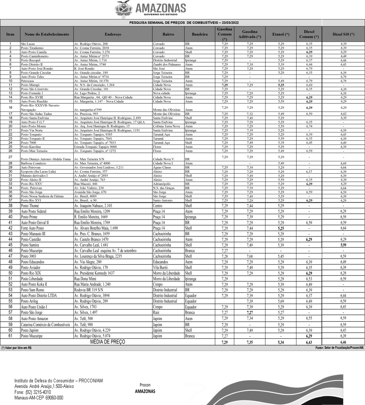 Já o valor mais baixo da Gasolina Aditivada (R$ 7,27) foi verificado no Posto São Jorge (Branca), na Av. Silves, 1.497, bairro Raiz, zona Sul.