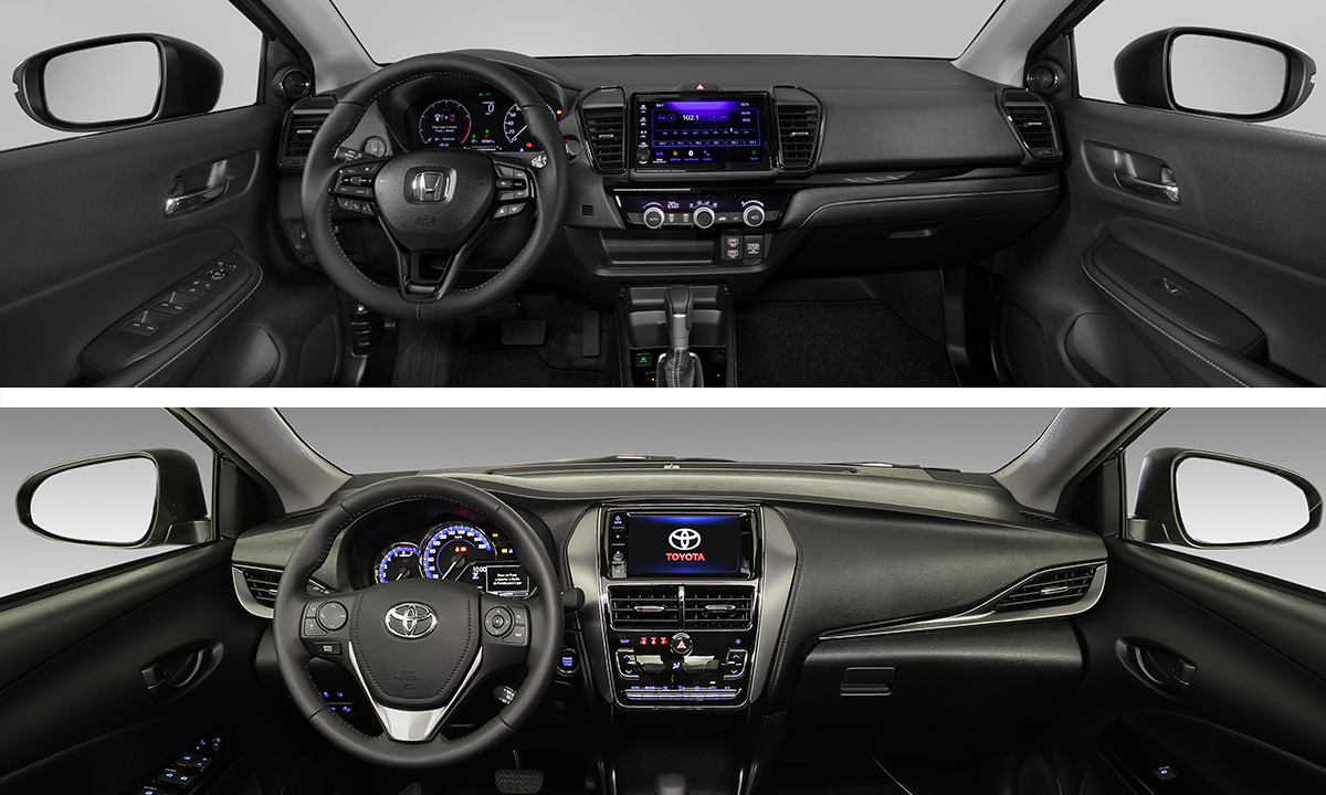 A lista de equipamentos é muito parecida até certo ponto: os dois têm chave presencial com partida por botão, assistente de partida em rampa, controle de tração e estabilidade, sistema de fixação Isofix para cadeirinhas, ar-condicionado automático, faróis e luzes diurnas de LED, câmera de ré e borboletas para troca de marchas. Mas em entretenimento, o Honda City vence com a sua tela multimídia de 8” com integração sem fio para Android e Apple CarPlay, contra 7” do Yaris com conexão via cabo USB. Além disso, o City tem sensores de estacionamento dianteiro e traseiro e ajuste de distância do volante, o que faltou no Yaris.