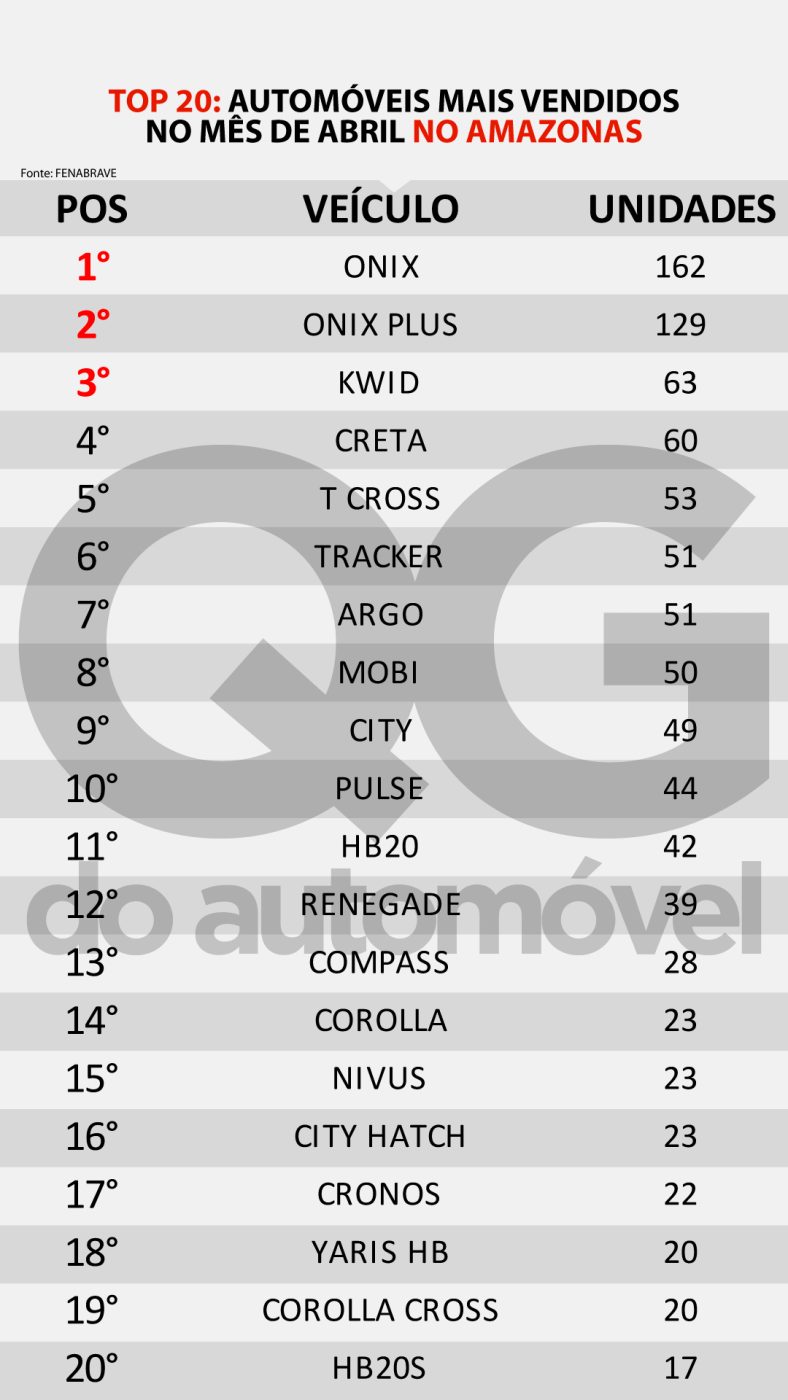 No ranking geral o Chevrolet Onix tem a liderança, com 162 unidades comercializadas, o irmão Onix Plus veio em segundo lugar, com 129 veículos e a Fiat Strada ficou em terceiro colocado, com 107 emplacamentos.