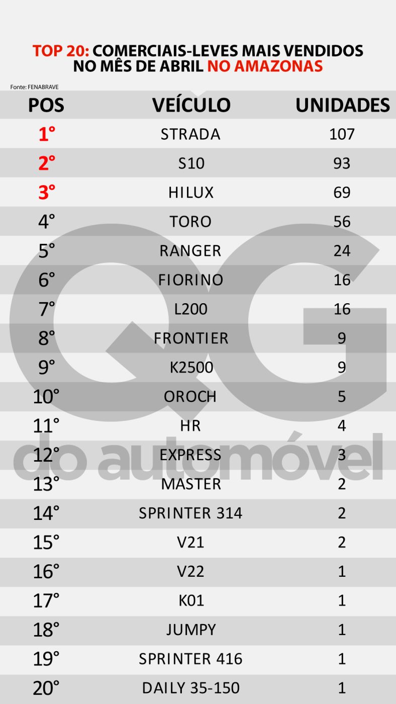 Os comerciais leves mais vendidos no mês de abril no Amazonas