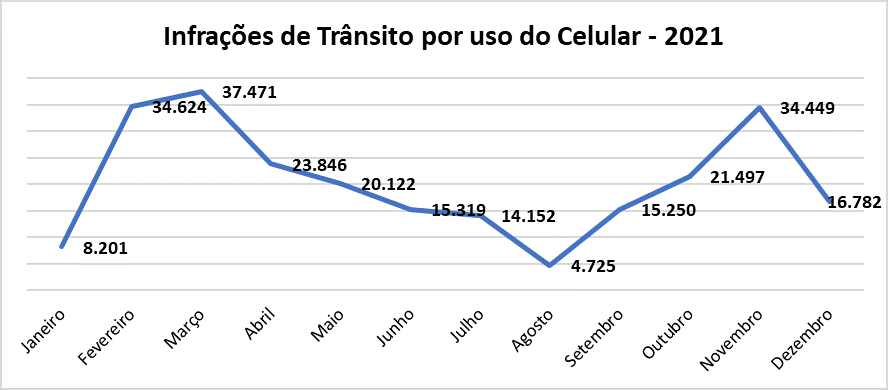 O levantamento divulgado pela Abramet mostra que, em todo o País, pelo menos 250 mil condutores foram flagrados utilizando o celular no trânsito em 2021, colocando suas vidas e de outros em riscos. Entre os estados brasileiros que se destacam por acumularem os maiores números desse tipo de infração, São Paulo lidera concentrando mais de 37% dos registros nesse período, com 91.362 ocorrências. Em seguida vêm os estados de Minas Gerais e Goiás, com 30.843 e 16.971 infrações contabilizadas, respectivamente.