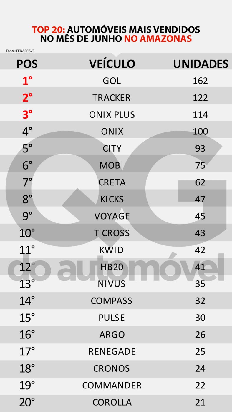 O Volkswagen Gol emplacou 162 unidades, o Chevrolet Tracker vem na segunda posição com 114 unidades, fechando o pódio vem o Onix Plus na terceira posição com 114 unidades emplacadas.