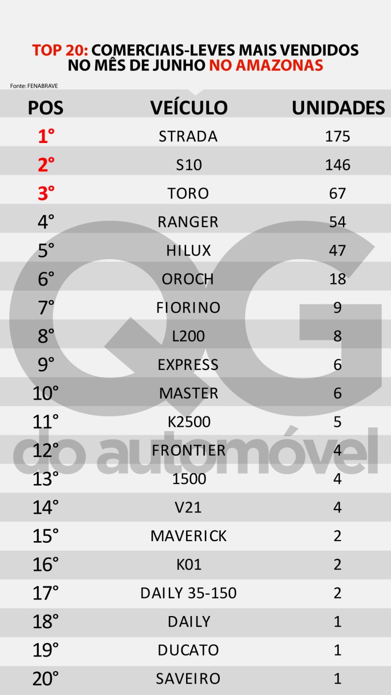 No ranking geral a Fiat Strada tem a liderança, com 175 unidades comercializadas, o veterano Volkswagen Gol veio em segundo lugar, com 162 veículos e a Chevrolet S10 ficou em terceiro colocado, com 146 emplacamentos.