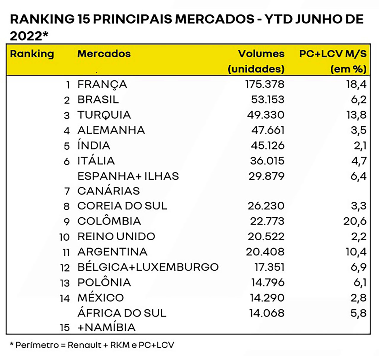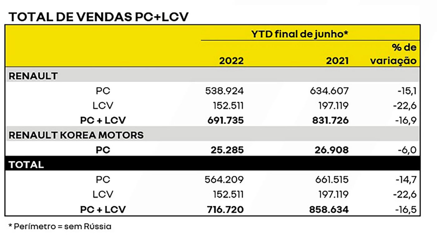 As vendas mundiais atingiram 716.720 unidades (-16,5% vs. o 1º semestre de 2021) e uma participação de mercado de 4,0% (-0,5pt vs. 1º semestre de 2021, Mercado e vendas excluindo China, América do Norte e Rússia). Na Europa, a Renault atingiu uma participação de mercado de 6,4% (-0,6pt vs. o 1º semestre de 2021) em 414.515 unidades.