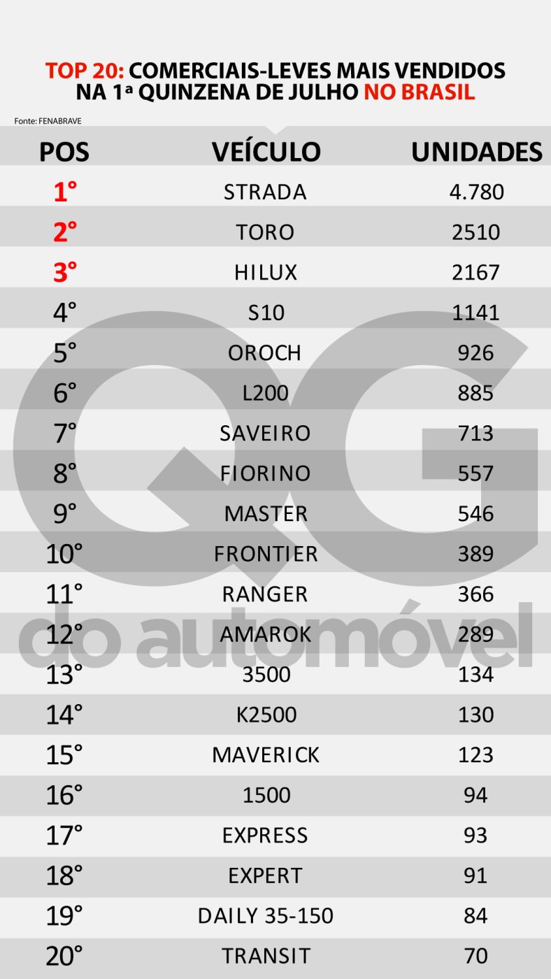 A liderança segue com a Fiat Strada, tendo 4.780 unidades emplacadas, na segunda posição vem irmã Fiat Toro, com 2.510 unidades. Já na terceira posição a Toyota Hilux com 2.167 vendidas.