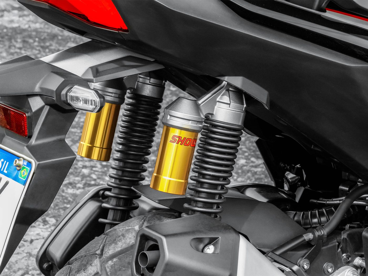 Suspensões de longo curso – 130 mm na dianteira e 120 mm na traseira – se aliam a um chassi tubular reforçado que garante tanto resistência a solicitações incomuns em se tratando de scooters como proporciona dirigibilidade adequada em qualquer tipo de piso, inclusive quando a pavimentação é ruim ou literalmente inexistente. Importante também neste quesito foi a opção pelos pneus mistos, com banda de rodagem de desenho adequado ao uso no asfalto ou fora dele.