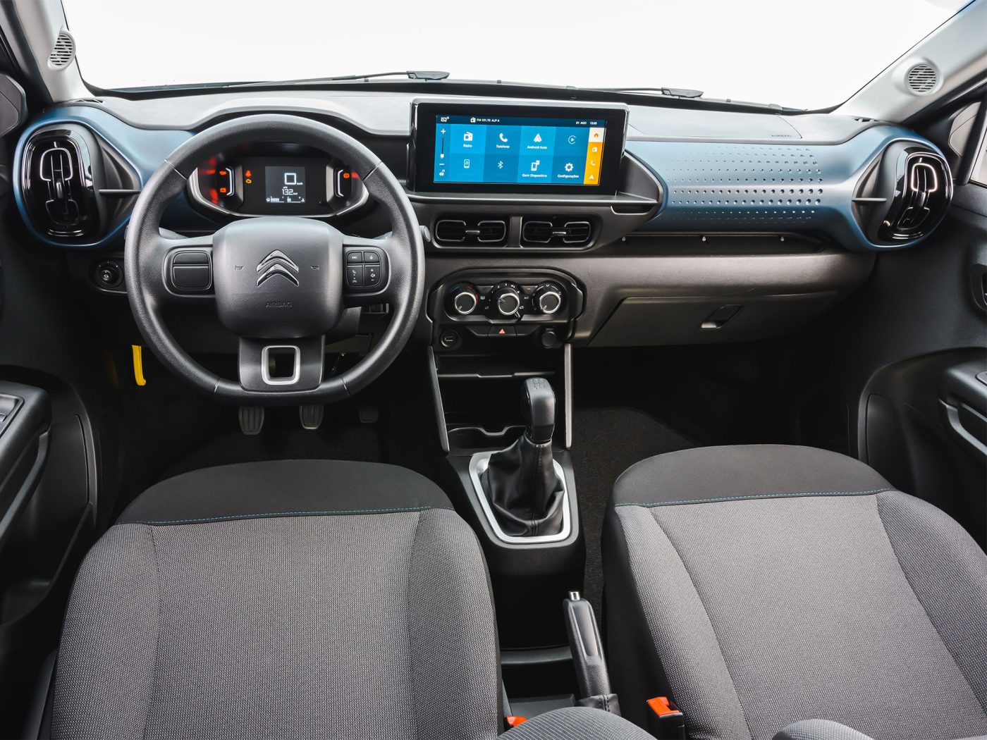 Elementos cromados podem destacar as ousadas saídas de ar-condicionado laterais verticais, enquanto os difusores centrais permitem uma rápida climatização de todo o interior, graças ao ar-condicionado de série com comandos reunidos em um só conjunto na parte central do console. E como estilo também deve ser acessível, todo C3 terá painel em dois tons, com um elemento central na cor Cinza Steel ou Azul Metálico cruzando horizontalmente todo o conjunto.