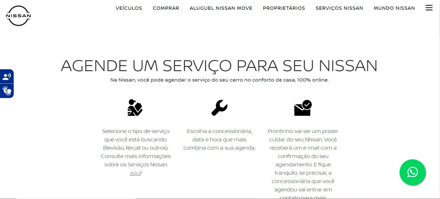 Seguindo com consistência em seu compromisso de ampliar a digitalização e facilitar a jornada dos clientes com os serviços da marca, a Nissan passa a disponibilizar mais duas ferramentas em seu sítio eletrônico oficial (www.nissan.com.br). Agora é possível agendar serviços para o veículo, como revisões periódicas, vistoria de recalls, troca de óleo, entre outros, e também consultar o estoque da rede de modelos zero quilômetros para localizar onde está o carro Nissan, na versão e na cor, que o cliente deseja.