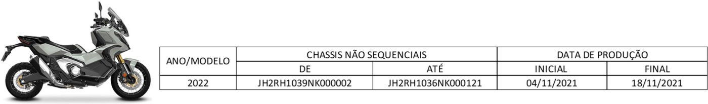 A Honda, pautada pelo seu princípio de respeito aos clientes, convoca os proprietários do modelo X-ADV, ano modelo 2022 conforme descrição a seguir, a realizarem o agendamento do atendimento em uma concessionária autorizada Honda Dream a partir do dia 03 de novembro.