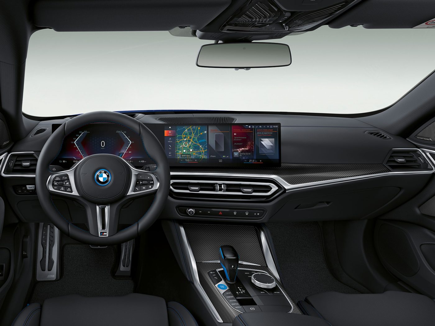 Por dentro, o BMW i4 é equipado com o BMW Live Cockpit Professional, uma incrível tela curvada que estreou no BMW iX e, recentemente, passou a equipar também o Série 3. Composta por duas telas, uma de 12,3” para o painel de instrumentos e outra de 14,9” para a multimídia, o conjunto roda o novo Sistema Operacional 8 e exibe as informações de maneira atraente e intuitiva.