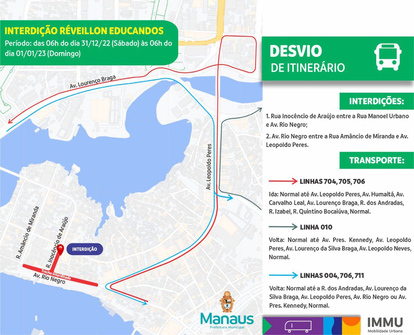O Instituto Municipal de Mobilidade Urbana (IMMU) prepara reforço na frota de ônibus que atenderá a praia da Ponta Negra, na zona Oeste da cidade; Orla do Amarelinho, no bairro Educandos, zona Sul; e shopping Phelippe Daou, localizado no bairro Cidade de Deus, zona Norte.