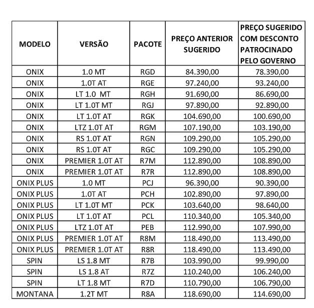 Devido a medida provisória do governo federal, o mercado automotivo conta com uma redução nos preços para automóveis em até R$ 120 mil. A  Chevrolet já apresentou quatro modelos e 21 versões que registraram quedas em seus valores.