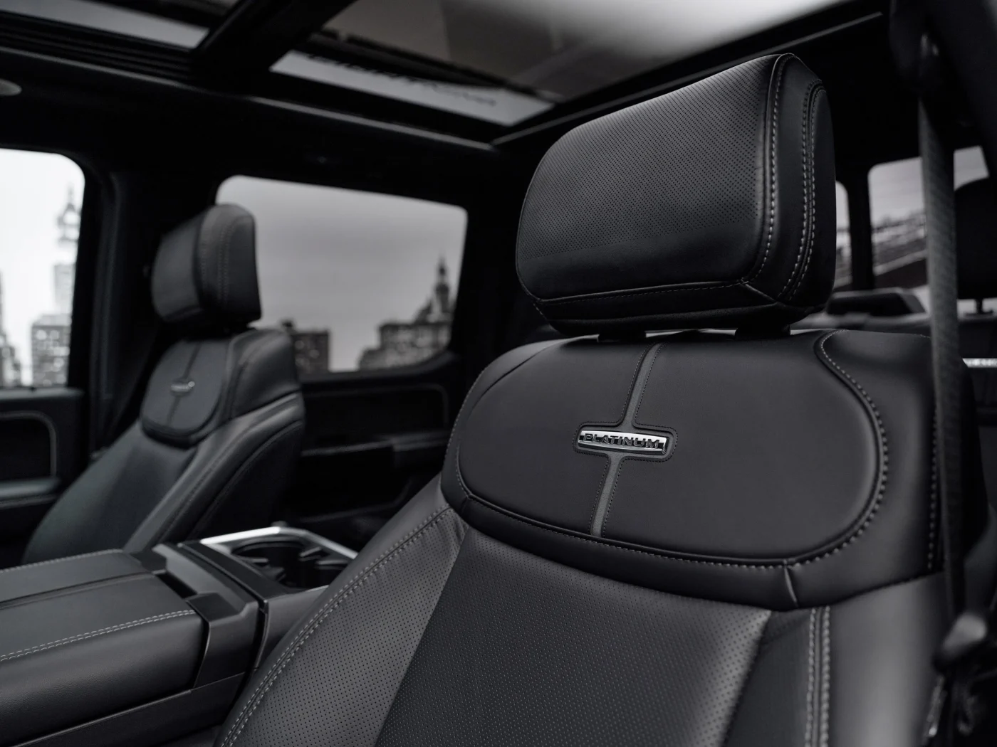 A F-150 Lightning Platinum Black é uma picape monocromática, combinando a tecnologia e a capacidade de potência do nível de acabamento Platinum de ponta envolto em um envoltório preto fosco exclusivo – o primeiro caminhão de produção envolto em fosco da empresa.
