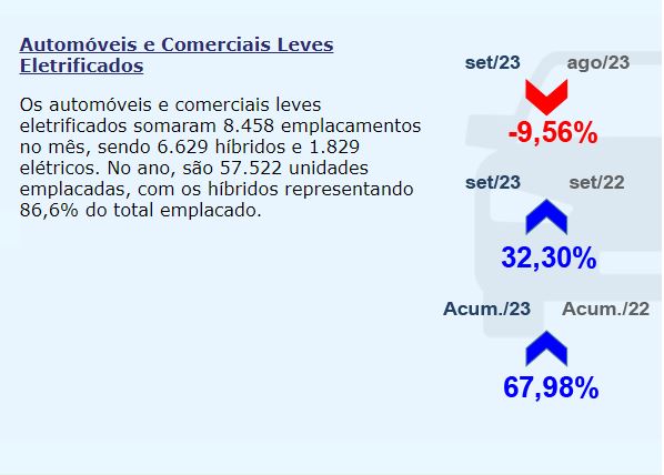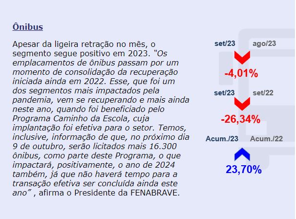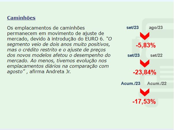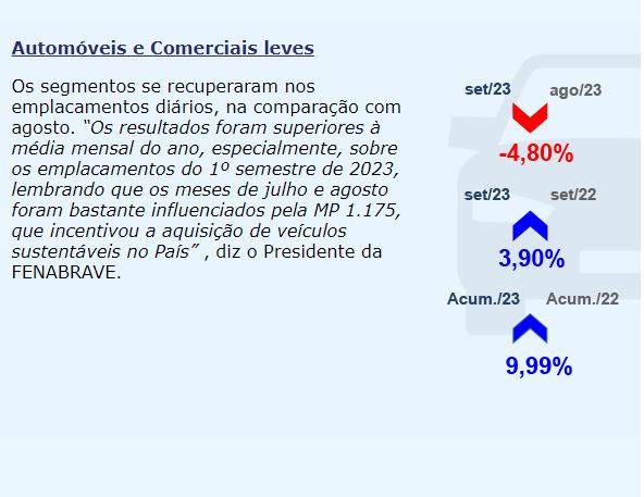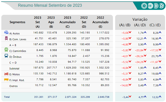 De acordo com levantamento realizado pela FENABRAVE – Federação Nacional da Distribuição de Veículos Automotores, os emplacamentos de veículos, em setembro tiveram queda de 5,4%, na comparação com agosto. Já em relação ao mesmo mês de 2022, houve alta de quase 4,8%. Com isso, no acumulado ano, considerando janeiro a setembro, o setor registra crescimento de 12,5%, com quase todos os segmentos – à exceção de caminhões – apresentando resultado positivo sobre o acumulado do ano passado, ainda que desacelerando sobre o resultado acumulado em agosto.