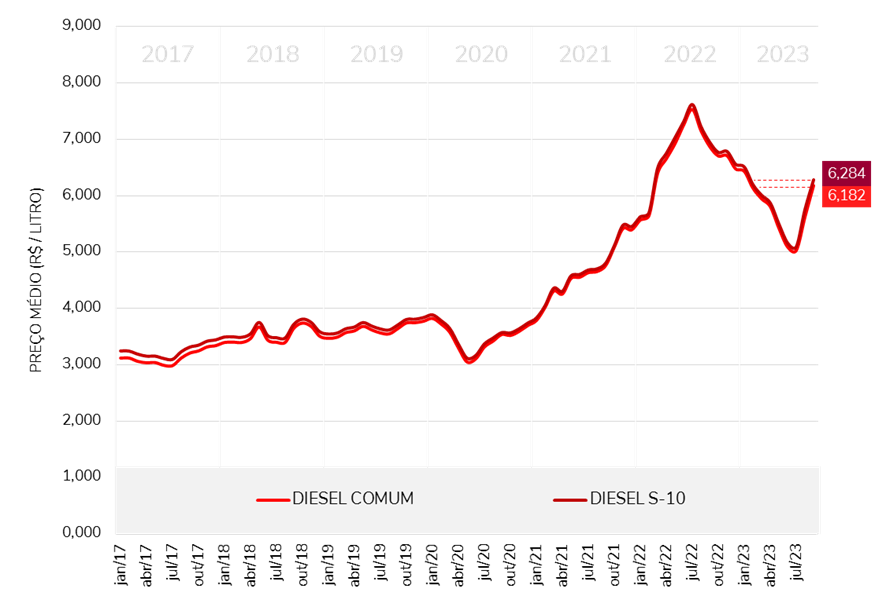 O diesel comum e o diesel S-10 sofreram aumentos expressivos do preço médio em setembro. As altas foram de 9,9% e 9,2%, respectivamente, em relação ao mês de agosto. No comparativo histórico – desde janeiro de 2017, o preço médio do diesel (S-10 e comum) atingiu em setembro de 2023 seu maior patamar desde janeiro de 2023.