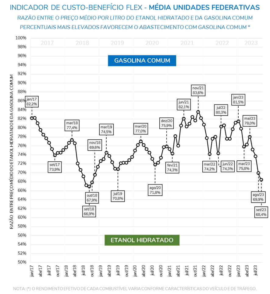 O Indicador de Custo-Benefício Flex aponta que o preço médio do etanol correspondeu a 68,4% do valor médio da gasolina, patamar inferior à marca de 70%. Trata-se do menor nível deste indicador desde outubro de 2018, quando marcou 67,9%.