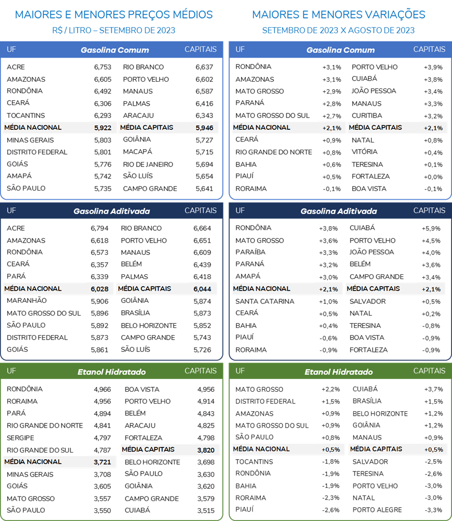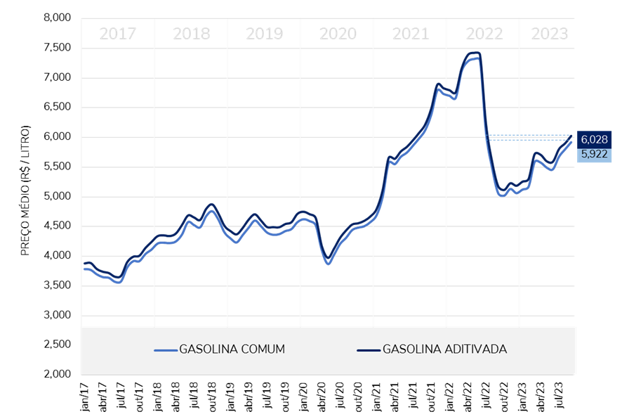 Como resultado, o preço médio da gasolina (seja comum ou aditivada) atingiu em setembro de 2023 seu maior patamar desde julho de 2022.